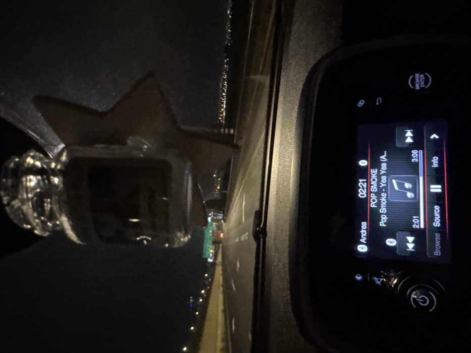 The photo shows a car's interior at night. On the dashboard, a music player screen displays "Pop Smoke - Yea Yea" by Pop Smoke, with the song playing at 2:21. The song's duration is 3:06, and the player has buttons for browse, source, and info. A star-shaped car freshener is visible on the dashboard, and out the windshield, a highway stretches into the distance with city lights twinkling far away. The scene suggests a nighttime drive.