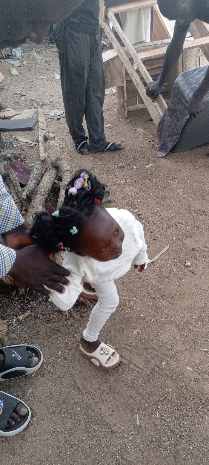 A young child in a white outfit and sandals is held by an adult with a plaid shirt. The child has dark hair adorned with colorful hair accessories. The setting appears to be an outdoor area with a sandy or dirt ground. Scattered around are logs, pieces of wood, and other debris. Other people are present, including one wearing dark pants and sandals, and another near a wooden structure.