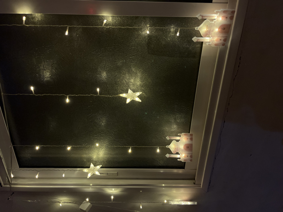 A window in a domestic setting within Nuseirat, Palestinian Territory, is decorated with illuminated ornaments and string lights