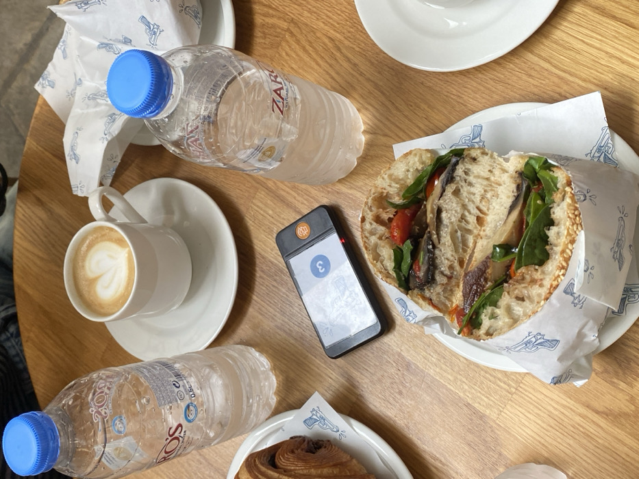 The image displays a meal set on a light-colored wooden table at a cafe in Athens, Greece. In the foreground, a large sandwich, cut in half, is presented on a white ceramic plate, wrapped in white paper featuring blue stylized illustrations. The sandwich filling consists of portobello mushrooms, fresh spinach leaves, and roasted red peppers. Towards the upper left, a white ceramic mug containing a cappuccino with a distinct heart-shaped latte art is placed on a matching white saucer. Two 0.5-liter plastic water bottles with blue caps are visible: one "AROS" branded bottle is positioned to the left of the cappuccino, and another "ZARO'S NATURAL MINERAL WATER" branded bottle is to the right of the paging device. Both bottles contain visible water, indicating partial consumption. A black electronic paging device, or order number display, lies centrally on the table. Its screen shows a blue background with a prominent white number "3," and a small red indicator light is illuminated on its right side. A partially visible pain au chocolat or similar pastry rests on a small white plate to the far left. No individuals are visible in the scene, which depicts a casual dining setting.