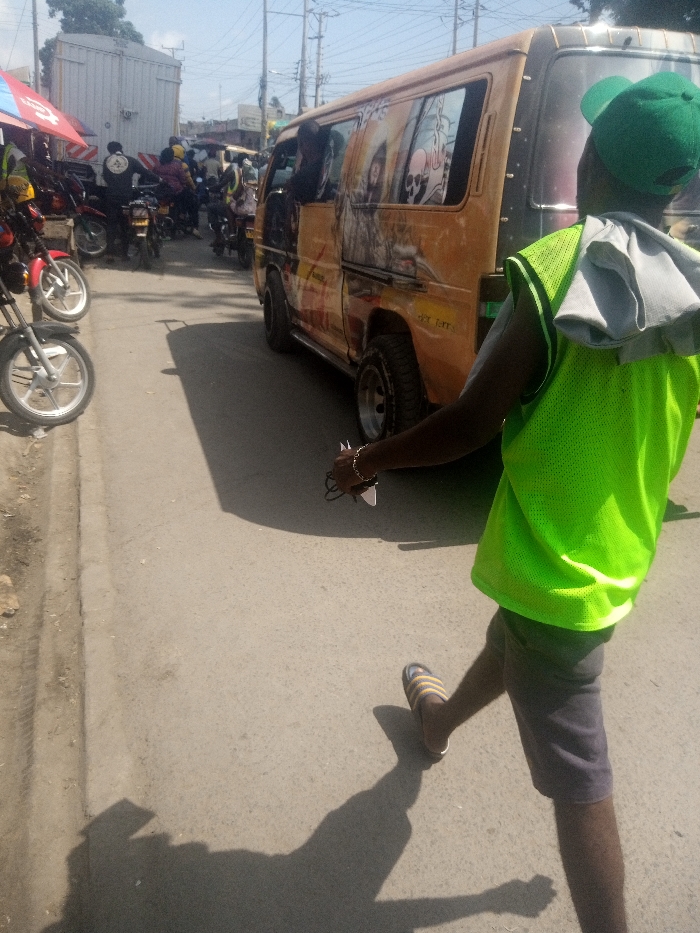 A man in a green vest, cap, shorts, and sandals walks on a sunny street. A yellow van with artwork on its side is parked nearby. Motorcycles line the left side of the road under a market canopy. More motorcycles and people are visible further down the road. Power lines stretch overhead. The scene is shot from a ground-level perspective.