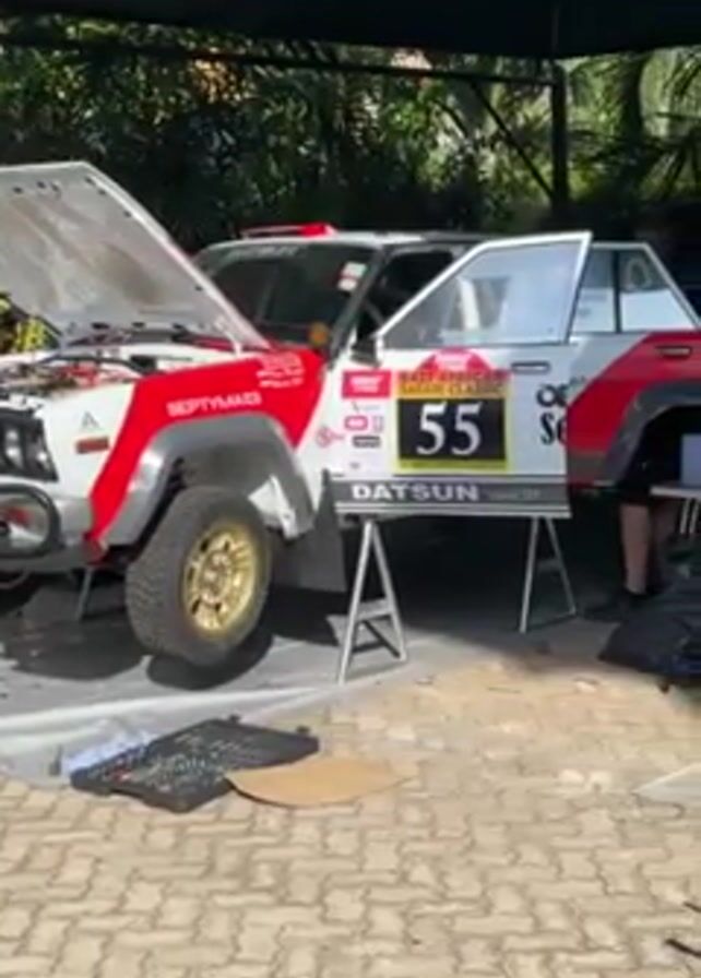 A white, red, and gray Datsun rally car with the number "55" is parked under a dark canopy. The hood of the car is open, revealing the engine. The driver's side door is also open, and the car is raised on two metal stands. A person is working on the car. There is a black toolbox and a piece of cardboard on the ground near the front left tire. The car has gold-colored wheels and a "SEQTYMAID" sticker on the front quarter panel. The background consists of trees and a paved area with interlocking brick pavers.