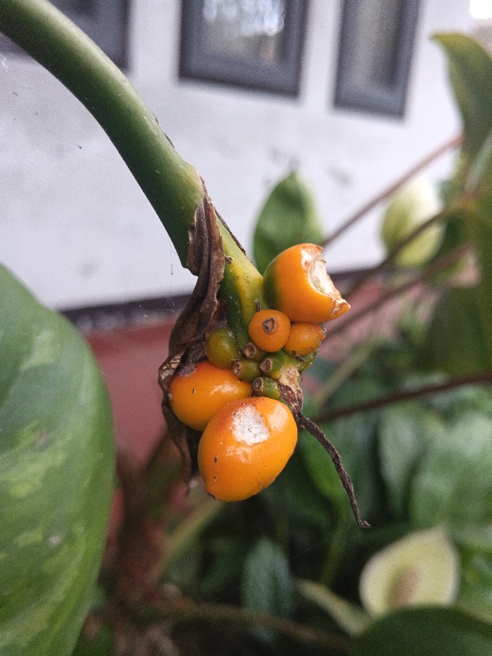 A close-up image depicts a cluster of approximately six prominent orange fruits, varying in size from spherical to ovoid, attached to a robust green plant stem. The largest fruits measure roughly 1.5 to 2 cm in length. One fruit located at the upper right displays a distinct crescent-shaped bite mark or abrasion, exposing a lighter, pale interior flesh. Another ovoid fruit positioned at the lower left of the cluster exhibits an irregular white patch on its surface. Interspersed among the larger fruits are several smaller, undeveloped or shriveled orange-green buds. At the base of the fruit cluster, the main stem transitions to a section with dry, brown fibrous material. A single slender, dark brown, dried root or tendril descends vertically from the cluster. A large, out-of-focus green leaf, showing subtle lighter green variegation, occupies the left foreground. The background is blurred, featuring additional green foliage on the right and a light-colored wall or structure in the upper central area, upon which two dark, rectangular, indistinct objects are visible. The scene is under ambient lighting conditions. Location: Ciherang, Indonesia.