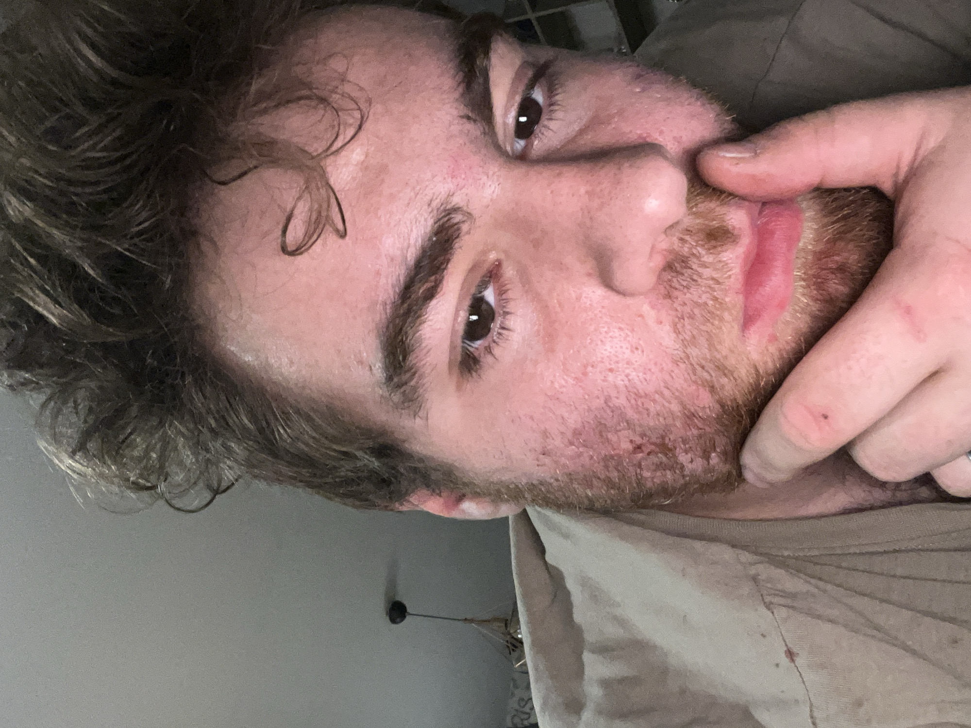Close-up, tilted perspective of a man's face. He has brown hair, brown eyes, and a reddish beard. His fingers are touching his face near his mouth. The background shows a light-colored wall and part of what appears to be clothing. There is no indication of location in Pernik, Bulgaria or other specific details about environment or actions.