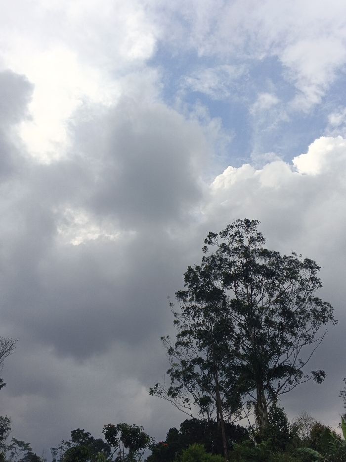 The image depicts a natural landscape in Lokossa, Benin. The upper two-thirds of the frame are dominated by a cloudy sky, featuring a mix of large, dense light grey to dark grey cumuliform clouds. Patches of clear blue sky are visible in the upper right quadrant, indicating breaks in the cloud cover. The lower third and right side of the image feature dense green vegetation. A prominent, tall tree with dark green foliage and a visible trunk occupies the mid-right, extending towards the upper frame. Below this, a continuous line of diverse green trees and shrubs forms the horizon. No people, animals, or man-made structures are visible.