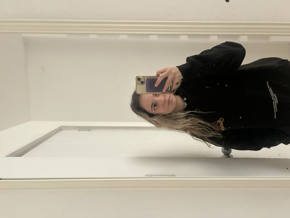 An indoor mirror selfie depicts a young adult female from the mid-chest up