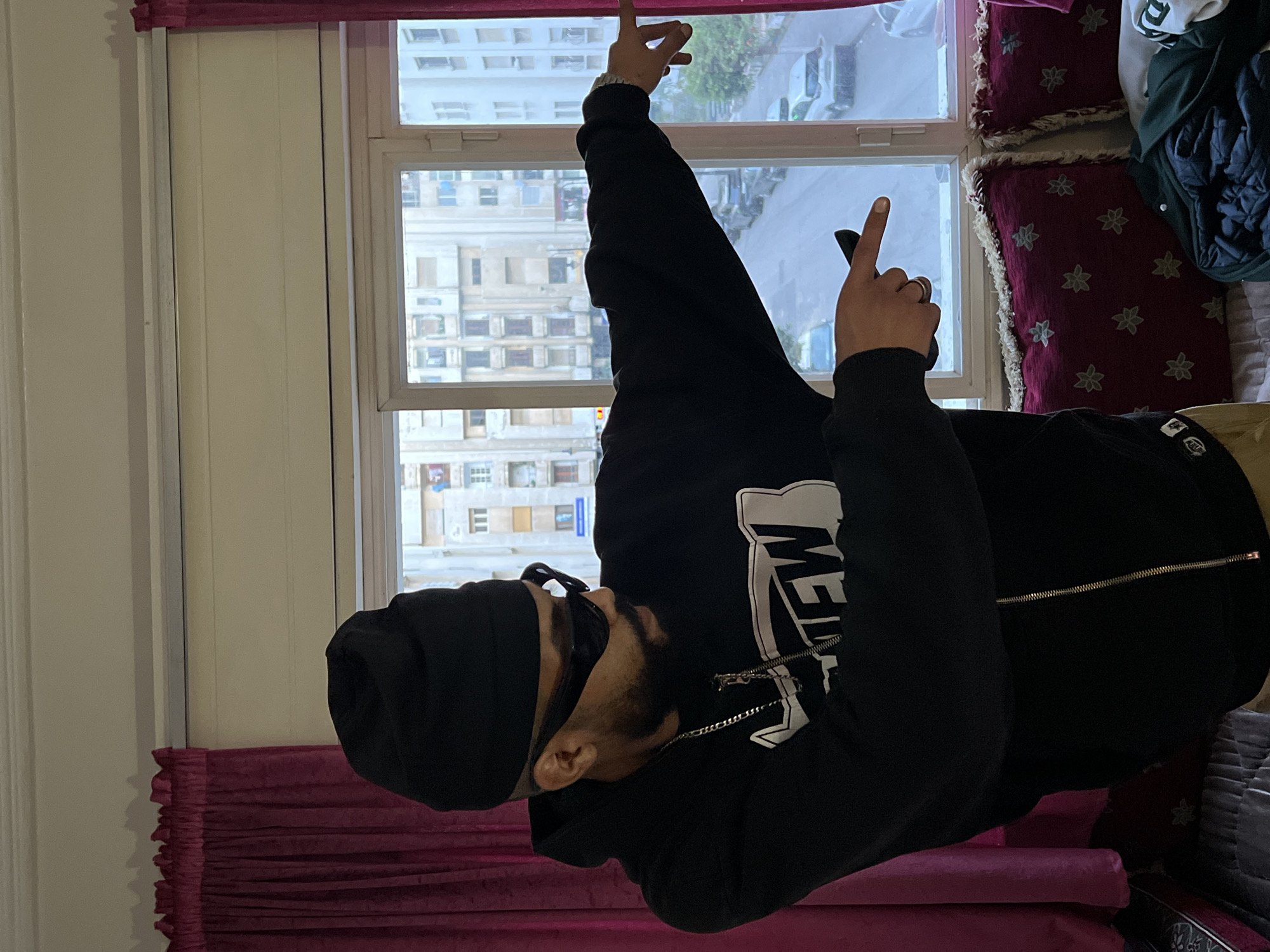 A man wearing a black beanie, sunglasses, and a black hoodie with white lettering is posing in front of a window. He is holding up two fingers on each hand, with the window showing a cityscape beyond. The building visible through the window appears to be located in Tanger, Morocco. Curtains are present at the top and bottom of the window. Cushions are also on the right.