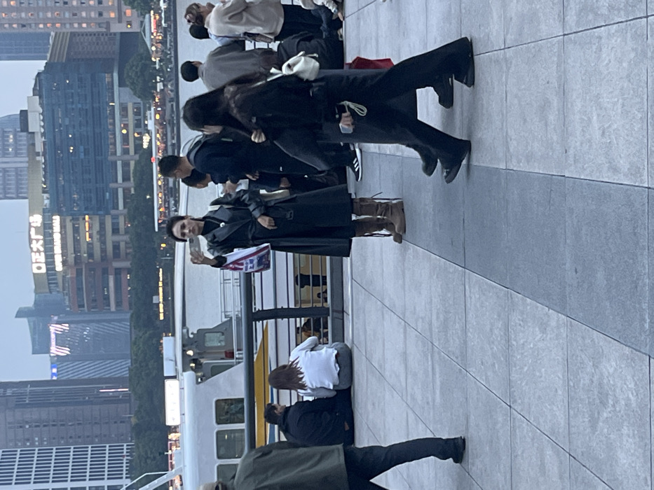 The image depicts a moderately crowded urban riverfront promenade in Shanghai, China, specifically overlooking the Huangpu River with the Pudong skyline in the background, including the "SUPER BRAND MALLS" building. The ground is paved with light and dark grey square tiles. In the center, an adult female with dark hair pulled back stands, holding a white smartphone horizontally with both hands, extended forward, seemingly taking a photo or video. She wears a dark, long trench coat over a dark turtleneck, a necklace with a round pendant, and light brown, high-laced boots. A white and red striped plastic bag hangs from her left wrist. To her immediate left, a male in a dark jacket and a female in a white long-sleeved top and light pants are seated on the tiled ground near a black metal railing. Further left, a person in a dark green jacket and dark pants walks away from the viewer. To the central female's right, another female walks past her, heading right, wearing a dark jacket, dark wide-leg pants, and carrying a white shoulder bag. Behind the central female, several individuals stand, some observing the river. A white and light blue passenger boat is visible on the river directly behind the railing. The background shows numerous high-rise buildings on the opposite bank under an overcast sky, with some artificial lights illuminating structures like the "SUPER BRAND MALLS" sign.