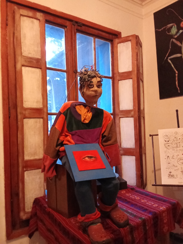 The image displays an indoor scene, likely a cultural or artistic venue in Santiago, Chile. A detailed, lifelike puppet or mannequin, with a light-toned face and head adorned with leaves and thin wires, is positioned centrally. It wears a long-sleeved, patchwork shirt in shades of orange, purple, green, and brown, an orange neck scarf, dark trousers, and reddish-brown clogs over reddish-orange socks. The puppet is seated on a dark wooden box, which rests on a table covered by a red, blue, and white patterned textile. It holds a blue rectangular board or book against its lap, featuring a smaller red square with a realistic painting or print of a human eye. Behind the puppet is a large wooden-framed window with multiple panes, through which a soft blue light from the exterior is visible, and the right-hand panel of the window is slightly ajar. To the right of the window, on a light-colored wall, a black canvas displays a stylized, pale insect figure. Further to the right, a white sheet of paper with black line drawings, characteristic of sketches or cartoons, is presented on an easel.