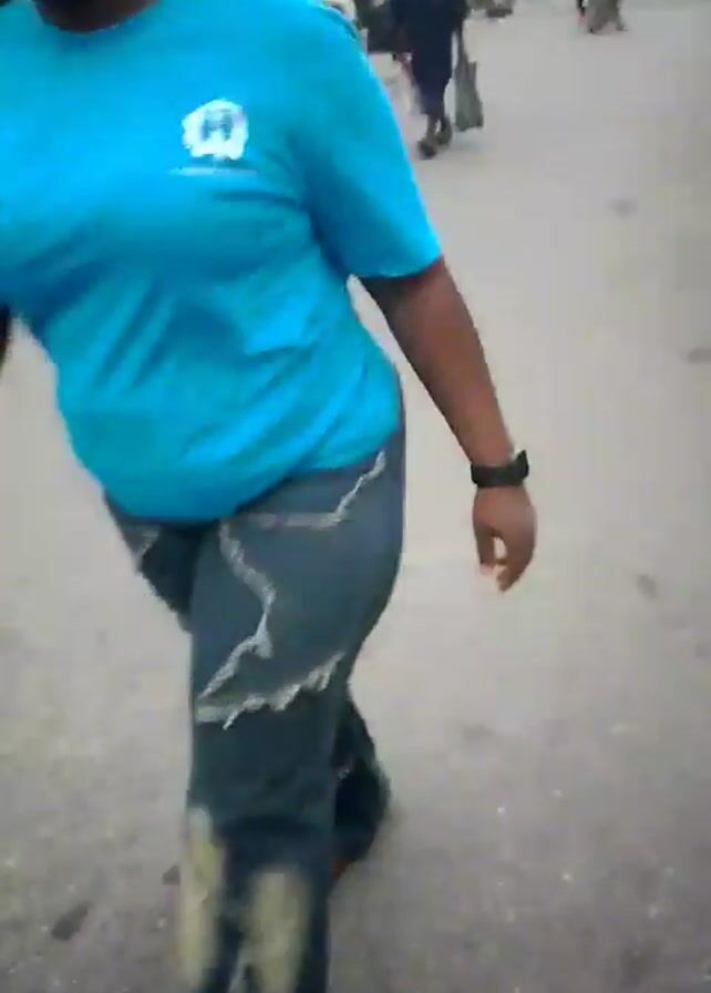 The video depicts a street scene. Initially, a person wearing a blue shirt and patterned pants walks towards the camera. Then, the camera pans to show a street with several people. A person in a white shirt is crouching near the front wheel of a parked vehicle, possibly working on it. Another person in a blue shirt walks towards the camera, carrying a black bag. Other individuals are walking in the background, and there are some buildings and structures visible. The street appears to be paved and somewhat worn.