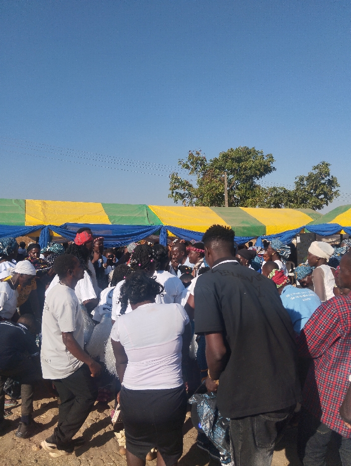 This image depicts an outdoor gathering in Idon, Nigeria, under a clear blue sky