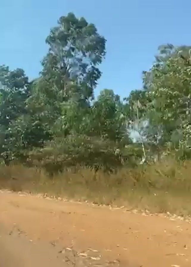 drive along a dirt road. The sky is blue. Vegetation, including trees and dry grasses, lines the road. At one point, a building can be seen through the trees. The video appears to have been taken from inside a moving vehicle.