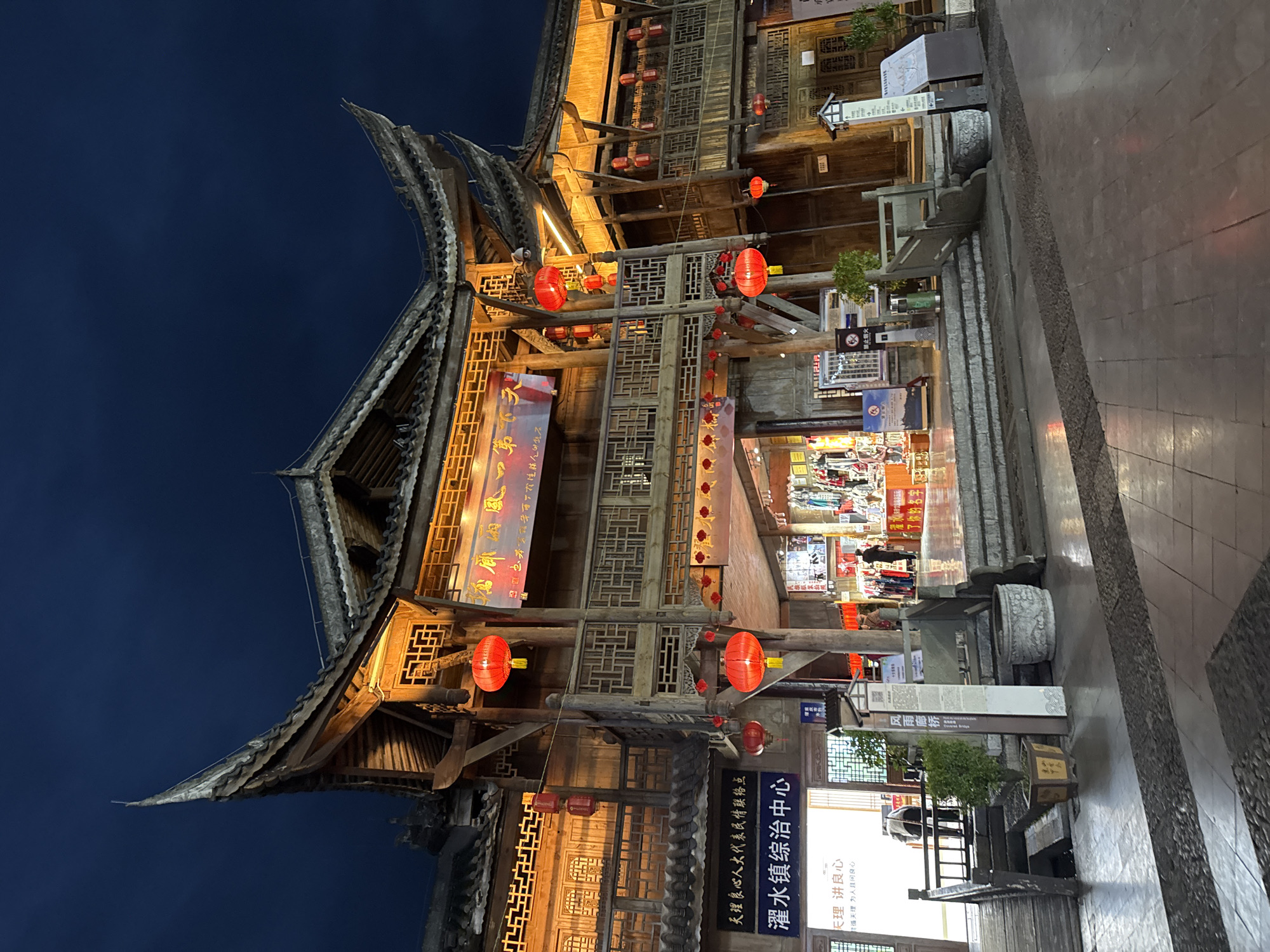 traditional Chinese building at night in the city of Zhuoshui, China. The building is illuminated with warm lighting and decorated with red lanterns. The architecture features multiple tiers and ornate details. There is a sign in Chinese characters, and signage indicating the "Zhuoshui Town Comprehensive Governance Center" and "Fengyu Langqiao (Corridor Bridge)." The surrounding area appears to be a paved walkway with steps leading towards the building's entrance. There are plants and informational displays visible along the walkway. Some people are visible inside the building.