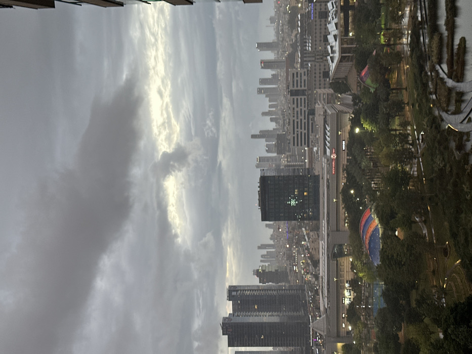 The image displays an elevated panoramic view of an urban landscape in Petah Tikva, Israel, under a predominantly overcast sky. The sky is characterized by thick, grey cloud cover, with a brighter, horizontally elongated band of yellowish-white light visible along the horizon line. In the background, a dense city skyline stretches across the entire frame, featuring numerous high-rise buildings and skyscrapers, many with reflective glass facades. A cluster of dark, tall structures is prominent on the far left, and a large, dark, multi-story building with illuminated windows stands centrally in the mid-background. Distant streetlights and building lights are visible across the urban expanse. The mid-ground contains a large, multi-story commercial complex, identified as a mall, with illuminated signage displaying Hebrew text. Below this structure, a significant green area, consistent with a park, features numerous trees, illuminated pathways, and a prominent, arched, multi-colored structure (red, orange, yellow, blue) on the left. A smaller, similarly shaped structure is partially visible on the right side of the park, and a blue-surfaced sports court is partially discernible. The foreground, specifically the lower right, depicts a wetland area containing dark water and patches of reeds or aquatic vegetation. A network of elevated, dark-colored boardwalks or paths curves over this water body. The extreme right edge of the image shows a vertical portion of a building facade, indicating the structure from which the photograph was taken. No individuals, specific actions, or interactions are observable. The scene is dimly lit, consistent with heavily overcast conditions during low-light hours.