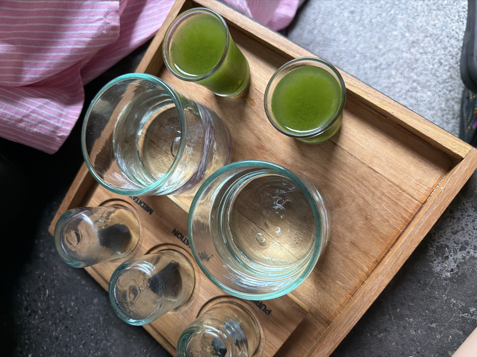 A wooden tray holds a collection of glasses. Two glasses are filled with a green liquid. Two larger glasses appear empty but contain water droplets. Three smaller glasses are inverted in recessed holders, also showing signs of prior use. A pink and white striped fabric is partially visible in the upper left. The tray sits on a dark surface, part of which is a grey, stone-like texture.