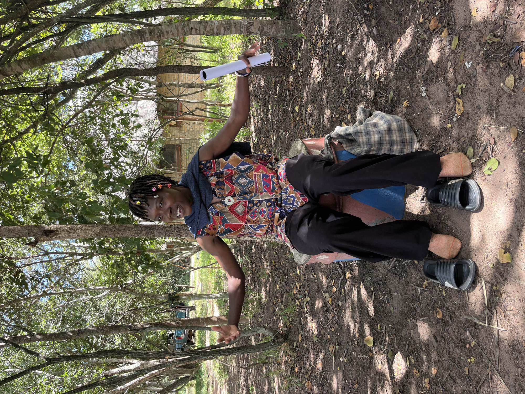 An individual is seated outdoors in Chitungwiza, Zimbabwe, within a partially shaded, natural environment. The person, with dark skin and dreadlocked hair adorned with colorful beads, is wearing a sleeveless, multi-patterned top with geometric and abstract designs in red, blue, yellow, and black, a dark blue scarf around the neck, and black trousers. A silver-colored pendant is visible on the shirt. The individual is positioned on a painted drum or barrel, exhibiting red, blue, and white sections. Both arms are outstretched; the left hand is open, and the right hand holds a white rolled document. The facial expression conveys animation, with an open mouth suggesting speaking, laughing, or singing. Two black slide sandals are placed on the dirt ground directly in front of the individual's feet, which wear orange-colored socks. A plaid fabric bag is situated on the ground to the individual's left. The ground is dirt, covered with scattered dry leaves, small branches, and sparse green vegetation. The scene is illuminated by bright daylight, casting dappled shadows. In the background, numerous trees with green foliage are visible. To the right, a light-colored brick building with a thatched roof and dark-framed windows is partially obscured by trees. To the far left, a teal-colored pickup truck is partially visible through the trees.
