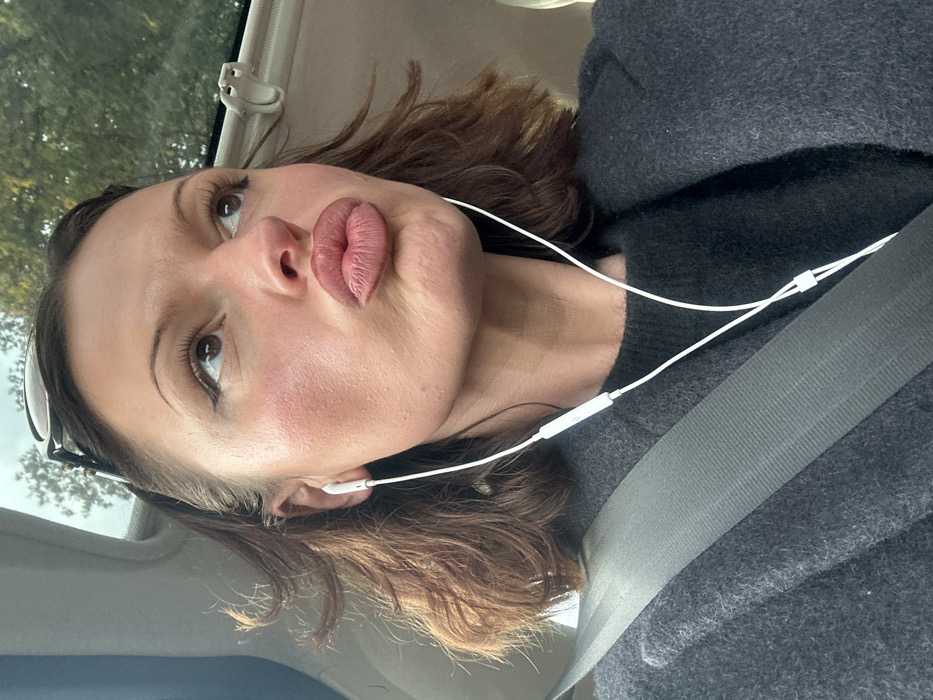 A woman is depicted from the mid-chest upward, situated within the interior of a vehicle. She has shoulder-length, wavy brown hair and is wearing white wired earbuds in both ears. Her face is presented in a partial profile, angled upwards and to the right, with her lips deliberately pursed. Dark-framed sunglasses are positioned on top of her head. She is attired in a dark gray textured coat over a black knitted sweater, and a dark gray seatbelt is securely fastened across her chest and shoulder. Above her, a light-colored vehicle interior headliner or trim is visible. Through a window in the background, green tree foliage and an overcast sky are discernible. This scene is located in Tunbridge Wells, United Kingdom.