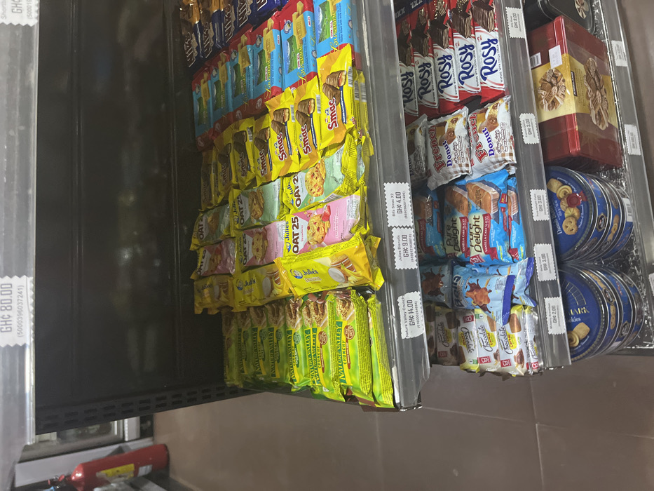 shelf stocked with various snacks. There are several rows of Julie's biscuits, in flavors like oat and strawberry. Smac chocolate bars and Nature Valley Crunch bars are also stacked. Further to the right, one can see Rosy chocolate sticks, French Donut biscuits, and Pure Delight Vanilla Cake slices. Tins of Danish Shorties cookies are positioned at the far right. Pricing stickers are visible for some items, with prices in GHC (Ghanaian Cedis). A fire extinguisher is partially visible at the bottom left.