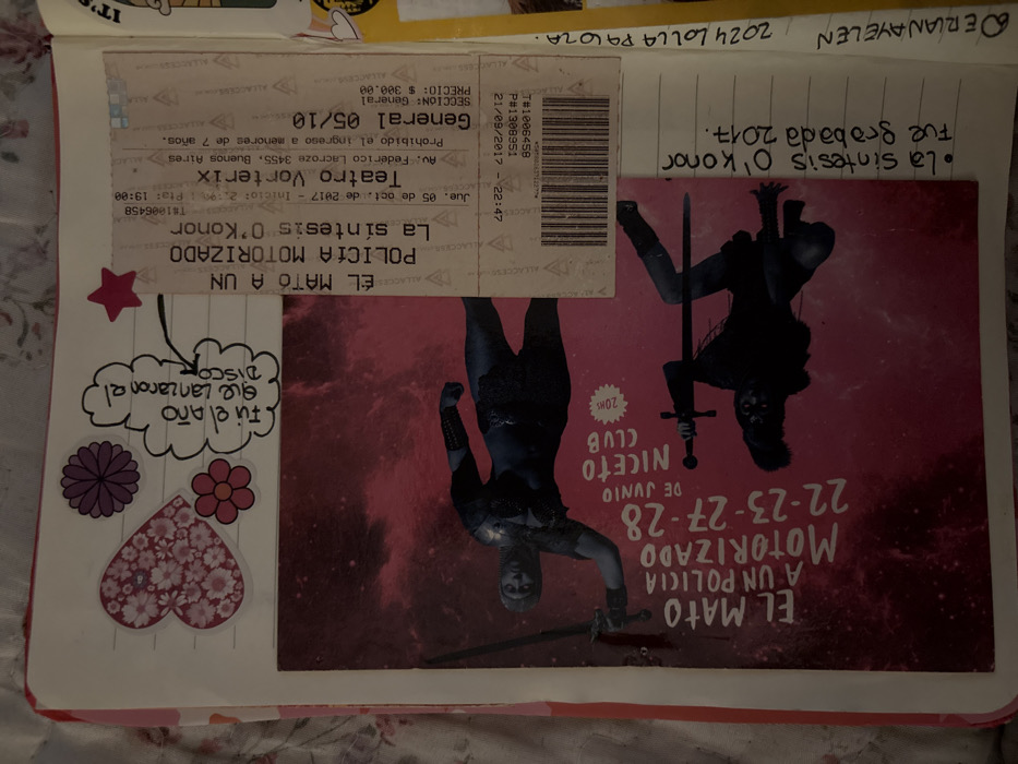 The image showcases a scrapbook page. It features a ticket stub from a "El Mató a un Policía Motorizado" concert at Teatro Vorterix on October 5, 2017. Additionally, there's a promotional poster for the same band performing at Niceto Club from June 22-23 and 27-28. Handwritten notes state "La síntesis O'Konor fue grabada 2017" and "Fui el año que Lanzaron el disco." The page is decorated with star, flower, and heart stickers, along with the address "2024 LOLLA PALOZA" and the name "DERIANAYELEN".