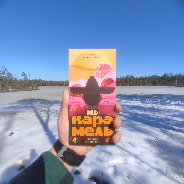 The image depicts an outdoor winter scene in the city of Парэцкі сельскі Савет, Belarus. A hand, clad in a dark green sleeve and wearing a black digital watch, holds a vertically oriented "Коммунарка ЭЛЬ КАРАМЕЛЬ" chocolate bar. The chocolate bar packaging is predominantly orange and pink, featuring a stylized silhouette of a person wearing a sombrero, surrounded by illustrations of raspberries. The text "ШОКОЛАД с малиной" (Chocolate with raspberry) is visible below the main title. The background consists of a wide, partially frozen body of water, with snow-covered ground in the immediate foreground, exhibiting long shadows from unseen objects. A dense line of evergreen trees forms the distant horizon under a clear, bright blue sky.