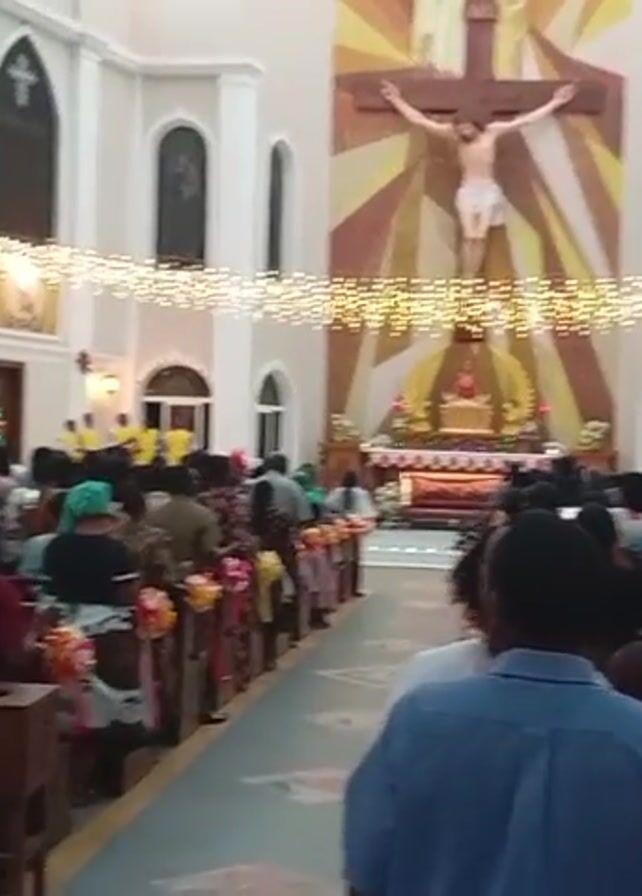 packed church with people standing in the pews and along the aisles. The church is decorated with strings of lights and colorful decorations on the pews. At the front of the church, there is a large crucifix with a figure of Jesus. People are facing the front, and some are raising their hands. There are people in yellow robes near the altar. The church has high ceilings and tall windows.