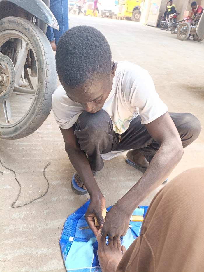 In Fagge C, Nigeria, an outdoor scene depicts a male pedicurist providing foot care to a client