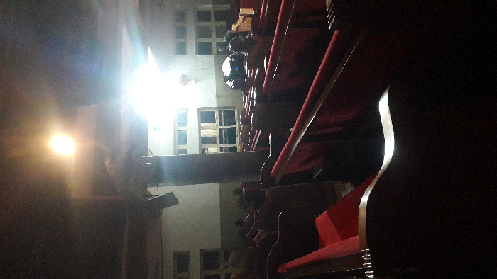 This image depicts the dimly lit interior of a large assembly hall, likely a church or auditorium, located in Onitsha, Nigeria