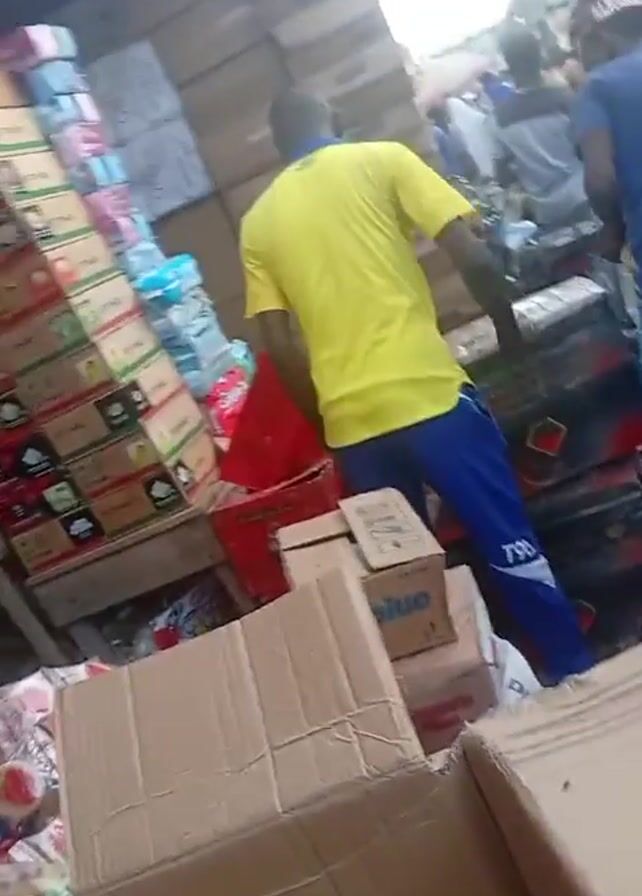 person in a yellow shirt walking in a warehouse-like setting, surrounded by stacks of boxes, water bottles, and other merchandise. There are also colorful balls in nets. A person in white clothing is then seen holding one of the balls. The environment appears cluttered and busy.