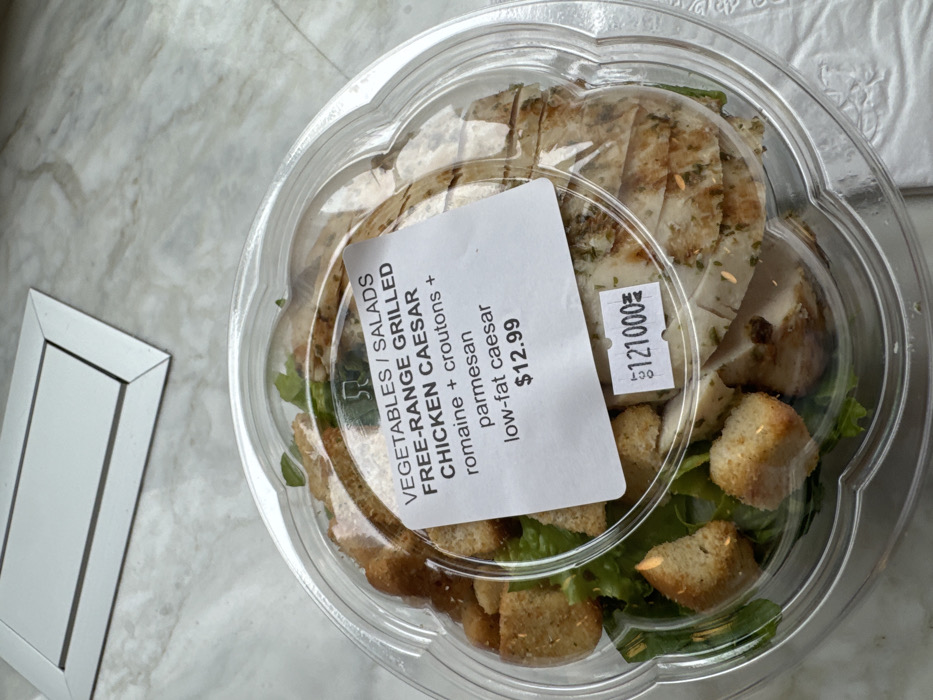 - "A transparent, round plastic container holding a "Free-Range Grilled Chicken Caesar" salad is presented from a high-angle perspective" by FM-tA4Nz1, licensed under CC BY 4.0
