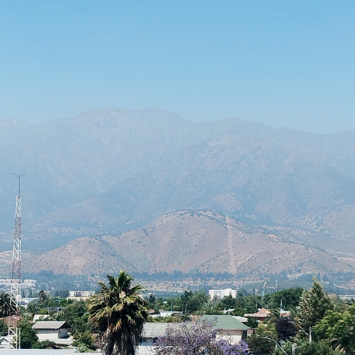 A wide cityscape shot under a clear, pale blue sky. Distant, hazy mountains dominate the background. A lattice-style communications tower is visible on the left. Below, trees and houses form a green and gray urban landscape. A tall palm tree stands prominently amidst the buildings and foliage. The scene has a slightly hazy, sunlit quality.