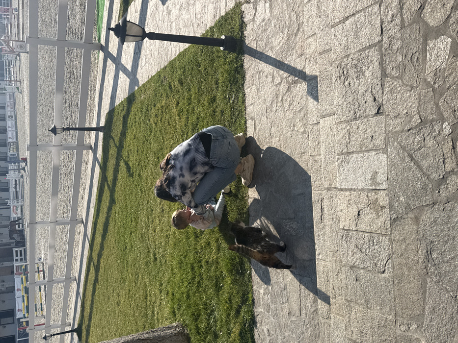 The image displays an outdoor scene in Duvanlii, Bulgaria, characterized by strong, low-angle sunlight casting elongated shadows. In the mid-ground, a female adult, dressed in a white and blue tie-dye long-sleeve top, light blue jeans, and tan footwear, is squatting on green grass. She faces a young child, who is seated on the grass, wearing a light-colored long-sleeve top and pants. Two domestic cats are visible in the foreground on a grey stone-paved path: one calico-patterned cat and one tabby-patterned cat, both walking away from the camera. The background features a white-fenced equestrian arena with a sandy surface, within which a dark-colored horse is present. Multiple white stable buildings with dark roofs are situated beyond the arena fence. Several equestrian obstacles are discernible within the arena. Two black, ornamental street lamps with frosted glass shades are positioned, one on the stone path to the right and another behind the grass nearer the arena fence. A tree trunk is partially visible on the left edge of the frame.