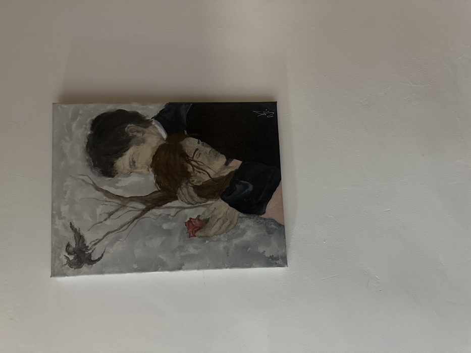 A rectangular painting is mounted on a textured white wall in Pravets, Bulgaria. The artwork depicts a man and a woman in an embrace against a muted grey background. The man, positioned behind and slightly to the right of the woman, has dark hair and wears dark-colored attire, possibly a jacket or suit. His left hand, extended towards the left of the frame, holds a single red rose. The woman, with brown hair, leans into the man's embrace, her head resting on his chest or shoulder, with eyes closed or downcast. Behind the figures, a bare, dark-branched tree extends upwards on the left. A dark winged creature is depicted in flight or perched near a branch in the upper left quadrant of the painting. An illegible signature in dark script is visible in the lower right corner of the artwork. The painting is presented without an external frame, displaying its canvas edges.