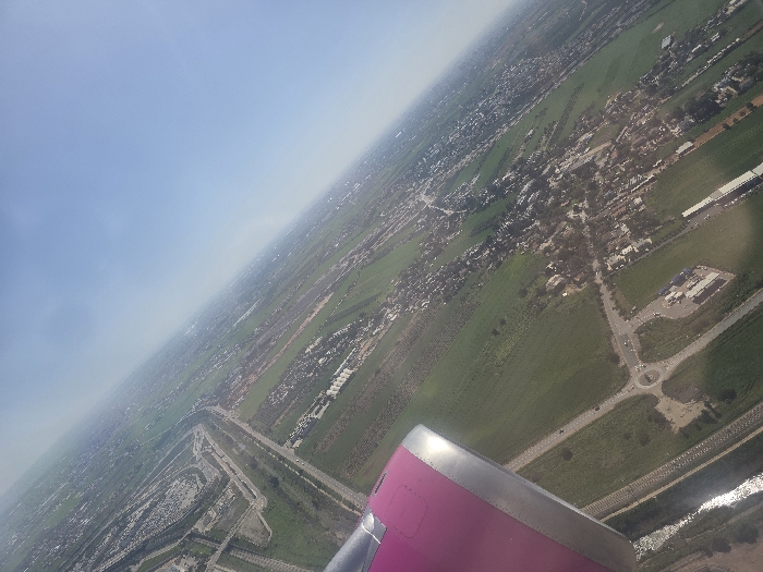 This aerial image provides a high-angle, oblique view of a cultivated and developed landscape, likely located within or immediately adjacent to the Sdot Dan Regional Council, Israel, specifically depicting areas near Ben Gurion International Airport (TLV). A portion of a magenta-colored aircraft engine nacelle with a metallic leading edge is visible in the lower-left corner, indicating the photograph was taken from an airborne airplane. The scene is dominated by extensive green agricultural fields, segmented by roads and irrigation channels. A major multi-lane highway traverses the mid-ground, flanked by built-up areas. In the lower-middle, a large roundabout serves as a junction for several connecting roads, near which a commercial or service complex with multiple buildings is situated. A narrow, reflective body of water runs parallel to a road in the far lower-left. Scattered residential or small community settlements, characterized by clusters of buildings and trees, are visible throughout the cultivated land. In the upper-left quadrant, a significant portion of an airport's infrastructure is discernible, featuring multiple runways or taxiways, extensive paved areas, and large industrial-type buildings, consistent with Ben Gurion International Airport. The sky in the upper-right is clear and light blue, with a slight atmospheric haze along the distant horizon. No individual persons or specific actions are discernible from this altitude.
