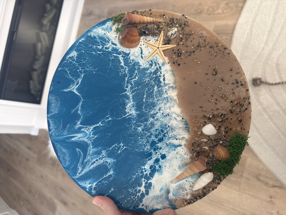 - "A human hand, appearing to be a left hand with light skin, holds a circular resin art piece that depicts a beach scene" by FM-GBY8N2, licensed under CC BY 4.0