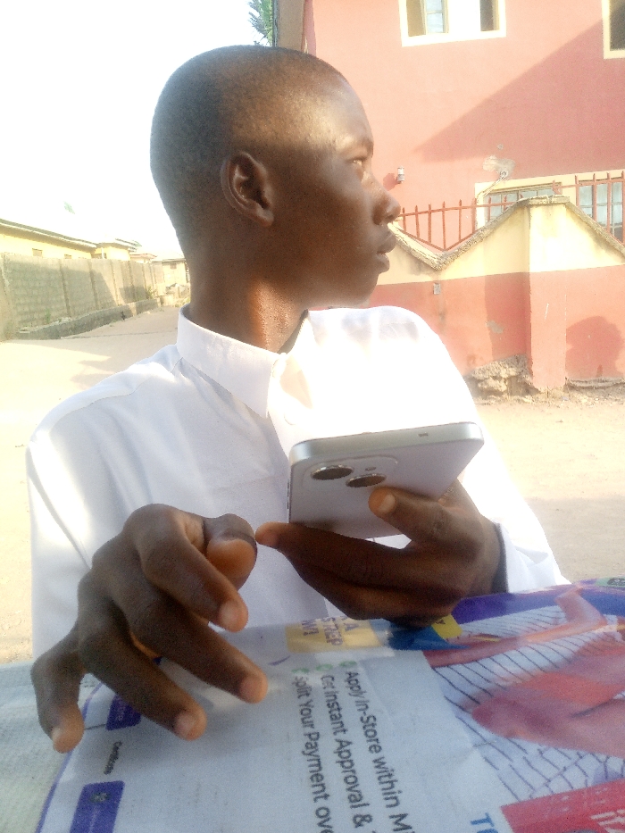 The image captures a young male in Zango-ndaji, Nigeria, depicted from the chest up and facing right. He possesses dark skin and short, dark hair, wearing a white collared shirt. His right hand holds a light-colored smartphone horizontally, featuring two visible rear camera lenses. His left hand rests on a white surface with printed text, partially legible as "Apply in-Store within M..." and "Get Instant Approval & Split Your Payment ove...". The background shows a two-story building with reddish-brown walls and white window frames, accompanied by a lower decorative wall to the right. To the left, a grey block wall and additional structures indicate an outdoor, likely residential, setting under strong daylight.
