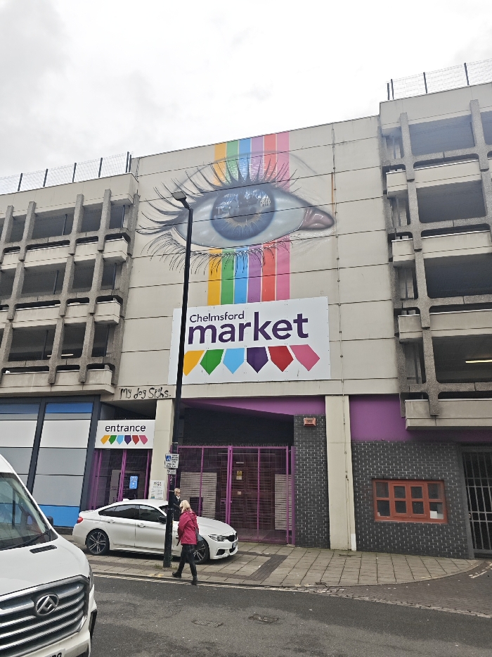 The image displays the exterior of a multi-story concrete building, identified as part of Chelmsford Market, located in Chelmsford, United Kingdom