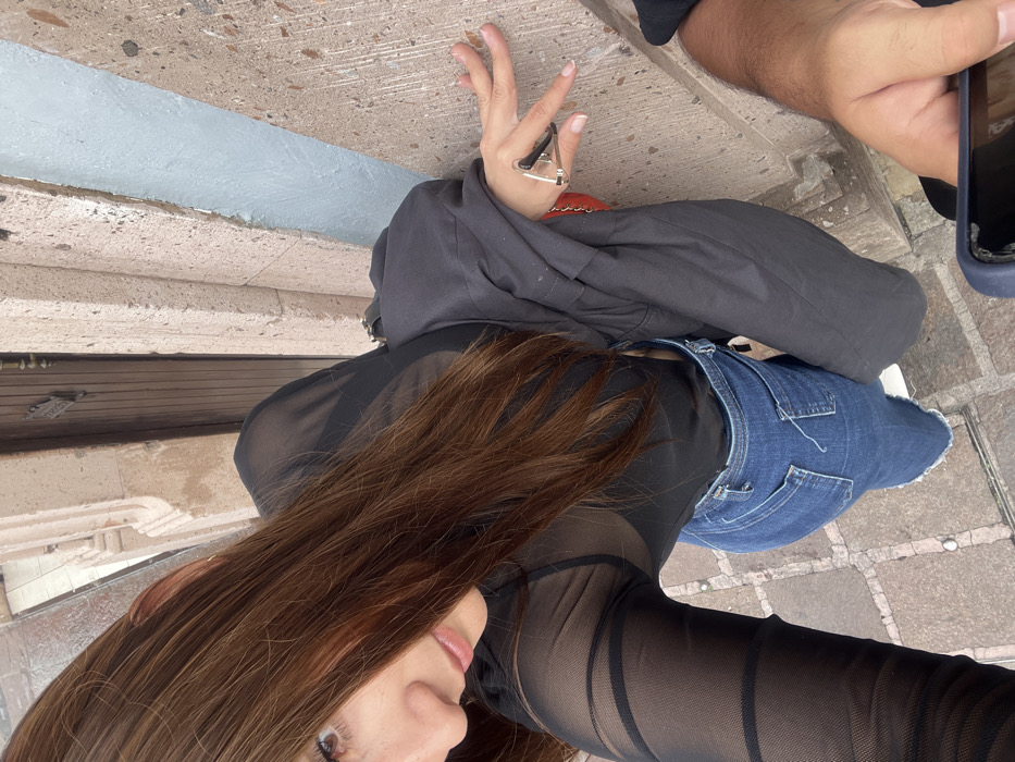 A high-angle, tilted photograph depicts a young female subject standing outdoors in what appears to be the historic city center of Morelia, Mexico. She has long, brown hair and wears a black sheer mesh top over a black bra, blue denim jeans with frayed hems, and light-colored shoes. A dark grey jacket is draped over her left arm, and a red bag is partially visible beneath it. Her right hand, adorned with light-colored nail polish, holds gold-framed sunglasses against a textured light brown stone wall. Behind her, a dark brown wooden door with hardware is partially visible. An adjacent wall section is recessed and painted light blue. The ground is paved with light-colored, rectangular tiles. In the lower right foreground, a person's forearm and hand are visible, holding a smartphone with a damaged blue case, indicating the photo's likely point of origin. The architectural elements are consistent with Morelia's colonial aesthetic.