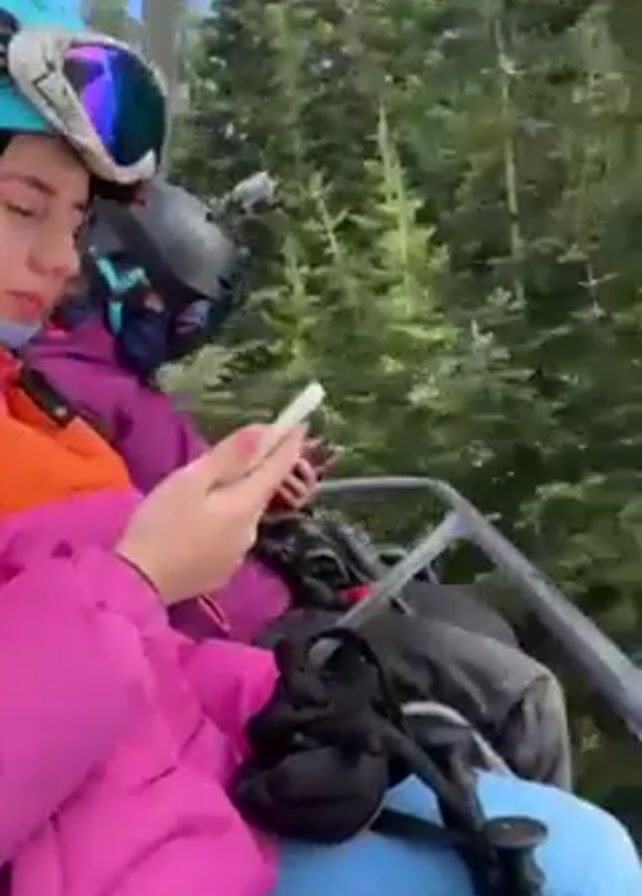 two individuals riding a ski lift. The camera is likely handheld, providing a first-person view from the chairlift. One person, presumably the videographer, is in the foreground wearing a pink and orange jacket, blue pants, and a blue helmet with goggles. They are looking at a smartphone. Another person is sitting next to them, wearing a purple jacket and a dark helmet. The chairlift passes over a snowy ski slope with scattered patches of green vegetation. Tall evergreen trees line the edges of the ski run. The weather appears sunny, with the sun visible through the trees. The video shows other ski lifts and skiers on the slope.