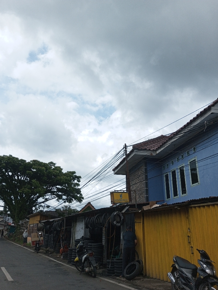The image depicts a roadside scene in Ganja City, Azerbaijan, under a partially overcast sky. A two-lane asphalt road occupies the left foreground, with a faint white line visible along its left edge. On the left side of the image, a large, mature tree with dense, dark green foliage is prominent. Along the right side of the road, a series of structures are visible. Nearest to the viewer is a two-story building featuring a reddish-brown tiled roof. Its upper section is painted light blue and contains three horizontally aligned white-framed windows. The lower part of this building exhibits a facade of irregular stone or brick cladding, from which a yellow corrugated metal barrier or wall extends to the right. Adjacent to this building, moving left along the road, are several informal, single-story commercial structures, likely workshops or tire service shops. These are constructed with corrugated metal elements and display numerous vehicle tires, both stacked in piles along the storefronts and hanging from the structures. A rectangular yellow sign with dark lettering, including "SIDO MUNCUL" and a stylized cup logo, is mounted above one of these shops. One individual, dressed in dark clothing, is standing near the entrance of one of the tire shops, leaning against the yellow corrugated wall. Their posture suggests engagement with the stacked tires. Further down the road on the far left, a second, partially obscured individual is faintly visible. Two motorcycles are present on the asphalt road: a white and yellow scooter parked in the center, in front of the tire shops, and a black scooter positioned further right, near the yellow corrugated wall. Overhead, a complex network of black electrical and communication wires crisscrosses, supported by utility poles and connected to the buildings.