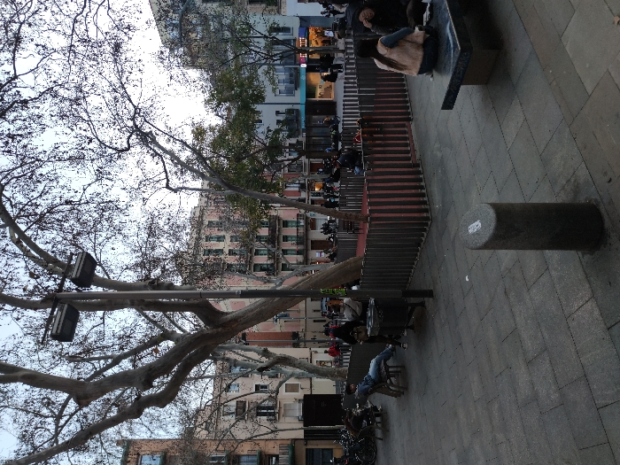 A street scene shows a tiered seating area with people, next to a plaza with stone benches and cylindrical bollards. Tall buildings line the background. A bare tree, its branches prominent, extends across the foreground, obscuring portions of the buildings. Streetlights are affixed to the tree. Bikes and other pedestrians are seen along the edge of the plaza.
