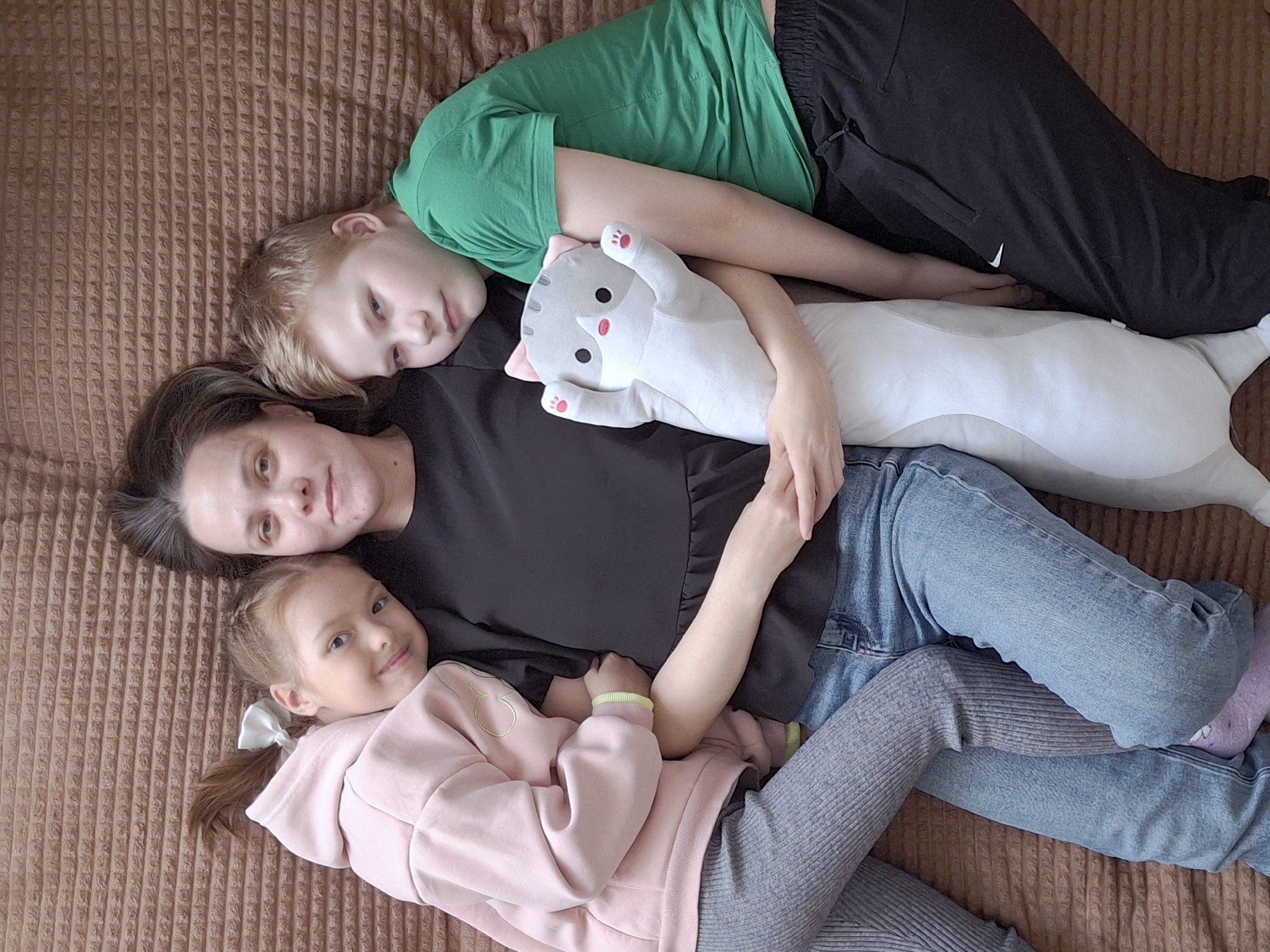 Scene: An aerial view shows a woman lying on a brown textured bedspread, with two children and a stuffed cat toy. The woman is wearing a dark-colored top and blue jeans. A young girl wearing a pink sweatshirt and gray pants is positioned to the woman's left. A young boy in a green shirt and black pants is on the woman's right. The stuffed cat toy is white and gray. Location: Likely a residential setting, presumably in Chaikovsky, Russia (as specified in the prompt).
