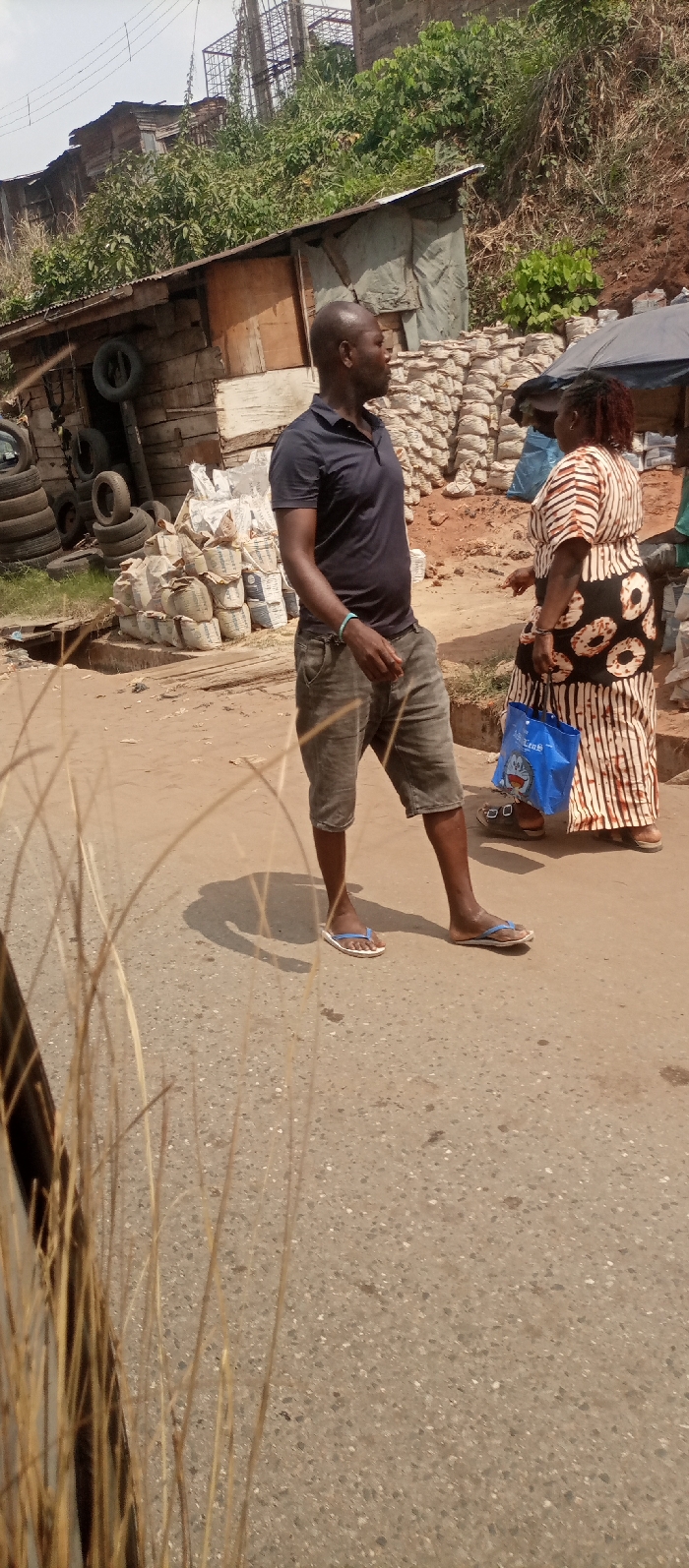The scene depicts an outdoor street or market area in Awkuzu, Nigeria, under daylight conditions. In the midground, an adult male and an adult female are interacting. The male, positioned left of center, is dark-skinned and bald, wearing a dark polo shirt, dark shorts, and blue and white flip-flops. A light blue bracelet is on his left wrist. He faces right, looking towards the female. His shadow extends to his left on the paved ground. The female, positioned to the right of the male, is dark-skinned with reddish-brown hair. She wears a long, patterned dress featuring vertical stripes on the upper half and large dark ring motifs on the lower half. She holds a blue shopping bag with a cartoon character print and gestures with her right hand towards the male. The ground is a light grey, paved surface, appearing dusty in areas. In the left background, stacked used tires lean against a rustic wooden structure with a corrugated metal roof. Adjacent to this, numerous white and blue sacks, likely containing construction materials, are stacked in piles. Further into the background, a steep dirt embankment covered in dense green vegetation rises sharply. Structures constructed from concrete blocks and metal scaffolding are visible atop the embankment against a light sky. Overhead power lines traverse the upper left portion of the image. On the right side of the frame, partially obscured by the woman, a dark canopy or umbrella is visible. Dry, light-colored grass stalks partially obscure the lower left foreground.