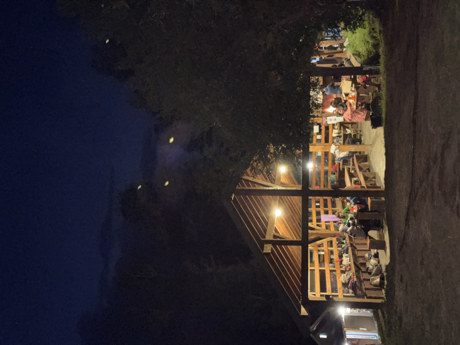 Illuminated pavilion at night with people inside. The structure appears to be made of wood with a peaked roof. Lights are affixed to the roof supports. A path leads past the structure. The night sky is dark with hints of green lights, possibly fireflies. A building with lighted windows is visible at the bottom of the frame. The image has been rotated clockwise.