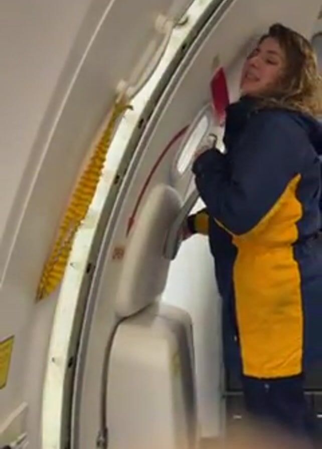 A woman wearing a navy blue and yellow coat, navy blue pants, and her hair in curls is shown opening the door to an airplane. She turns the handle counterclockwise and pushes the door inward. A yellow emergency rope hangs down from above the door. Inside the airplane, gray cabinets and equipment are visible. The door is white and has a red arrow pointing to the word "Open." The video is taken from inside the plane.