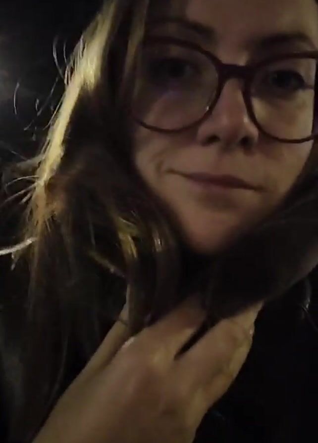 A woman is holding the fur trim of her jacket around her neck while facing the camera. She is wearing glasses and has long hair. A tattoo is visible on her hand. The background is dark.