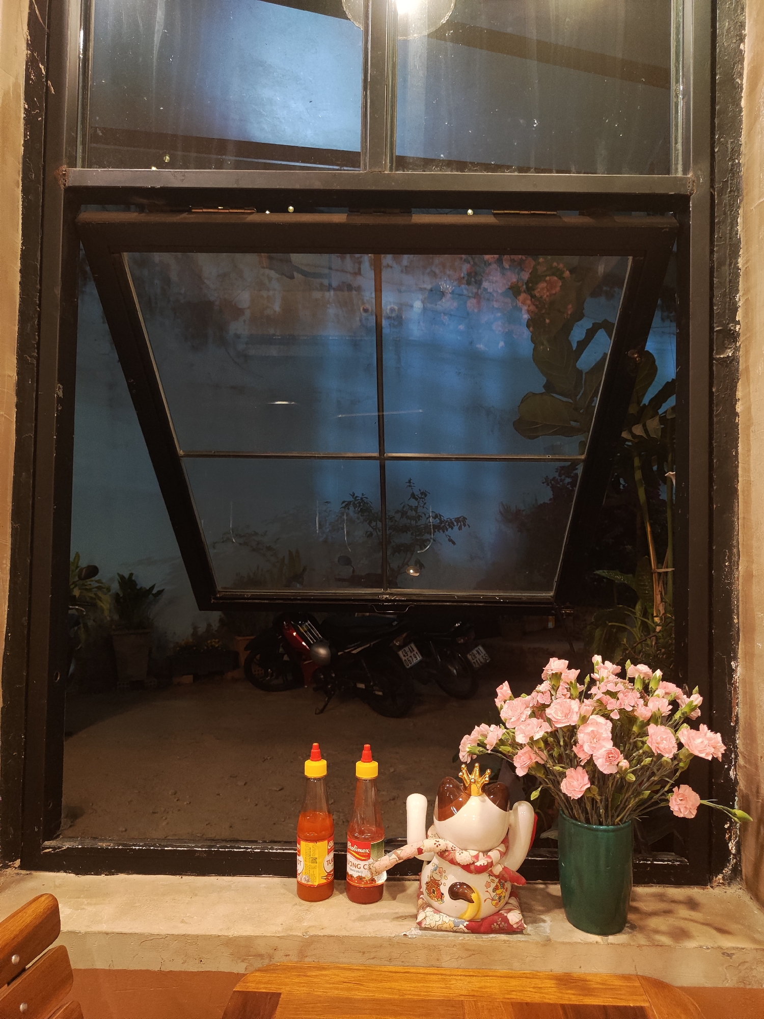 A partially open window frames an outdoor scene in Da Lat, Vietnam. Outside, several motorbikes are parked. Two bottles of chili sauce and a maneki-neko figure are placed on the window sill, next to a green vase of pink flowers. The window's black frame contrasts with the neutral tones of the interior wall.