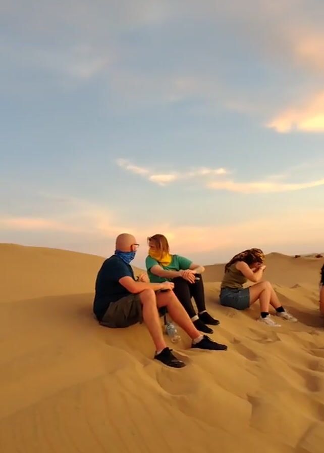 A group of at least nine people is sitting on a sand dune, possibly in a desert