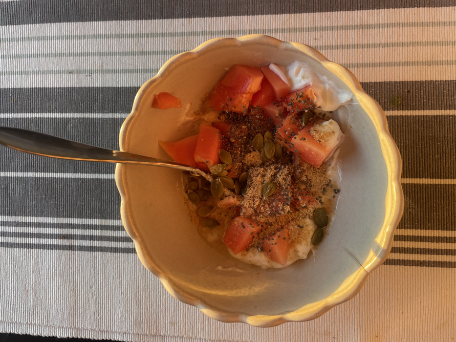 An overhead view depicts a light-colored ceramic bowl with a scalloped rim, containing a mixture of food. The bowl holds a white, viscous base (consistent with yogurt), numerous pieces of diced red-orange fruit, scattered dark green pumpkin seeds, small black chia seeds, and a layer of light brown granular powder. A metallic spoon is partially inserted diagonally into the mixture, resting on the contents. A fine, linear crack is observed on the upper left rim of the bowl. The bowl rests on a fabric placemat patterned with alternating parallel stripes of light beige and dark gray. The scene is illuminated by a warm, directional light source from the left, casting soft shadows and highlighting the bowl's right side. No individuals or actions are depicted. The image provides no discernible information regarding its location within Aldoar, Foz do Douro e Nevogilde, Portugal.