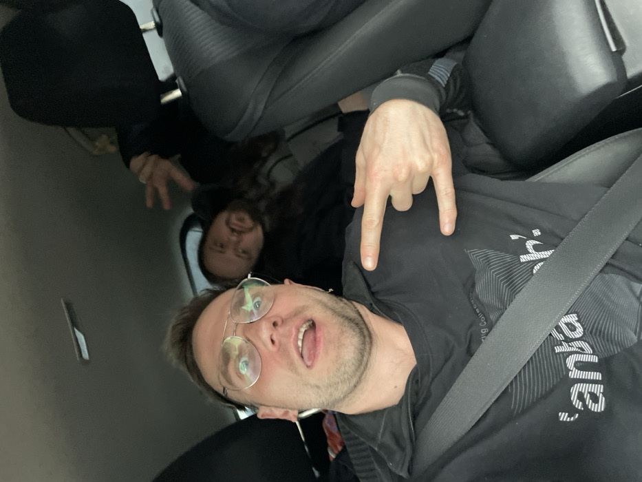 Two men are posing inside a vehicle. The man in the foreground wears round glasses and a black shirt and is sticking out his tongue. He's also wearing a seatbelt. Behind him, another man with long hair is giving a peace sign. A hand is making the "rock on" hand gesture over the foreground man's shoulder. The interior of the vehicle is primarily dark gray and black.