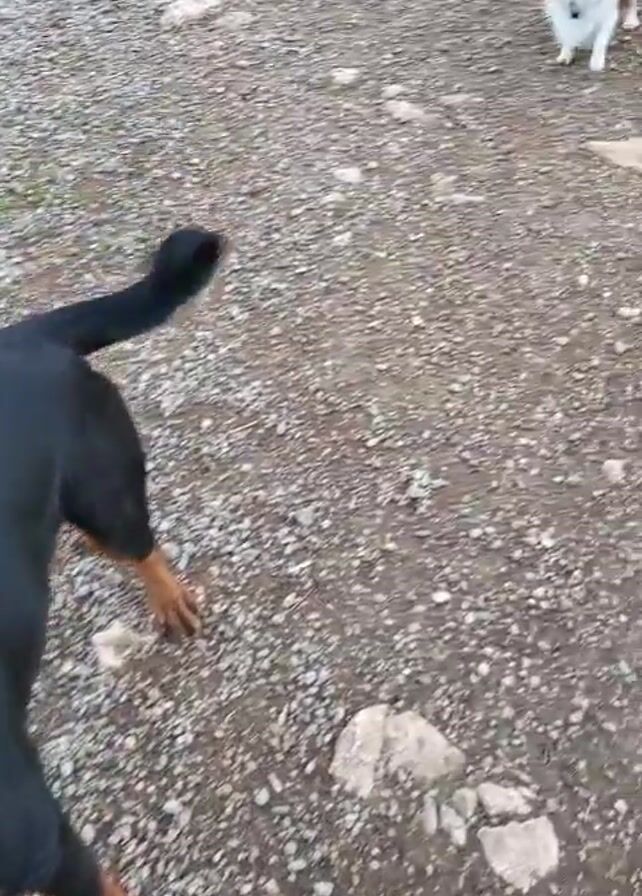 black Rottweiler dog and a Papillon dog on a gravel ground. The Rottweiler is wearing a white patterned collar. The Papillon is white with brown markings. The Rottweiler barks and looks up while the Papillon moves around in the background. Someone off camera says, "This means no one will eat me."